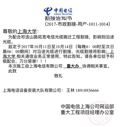 接中国电信光缆割接通知,兹定于2017年10月11日至10月14日(每晚0:00时至次日晨06:00期间)对沿途光缆进行割接,光缆割接将影响beat365唯一官网相关通信业务正常使用,届时将会对校园网络造成影响,特此告知!