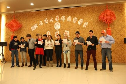 2月7日晚上, 国际交流学院在宝山校区益新食堂三楼举办留学生年夜饭,有150多位春节假期留校的外国留学生参加。校党委副书记鲁雄刚、副校长吴松、校长助理兼艺术中心主任李伟、学工办主任林海霞、校团委书记胡大伟以及国际交流学院党总支书记李坚、副院长沃国成、杨静和部分干部教师代表与留学生一起共进年夜饭。吴松副校长在致词中代表学校领导对留学生致以新春的祝贺,祝愿留学生在即将到来的蛇年学习进步、身体健康、万事如意!校、院和部门领导们还一起来到每张桌子举杯向留学生祝贺新年。来自马达加斯加和美国等国的留学生们还即兴表演了精彩的文艺节目。来自各国的留学生代表还先后来到校院部领导们的餐桌向他们致以新春的祝贺并与他们合影留念。在一片欢声笑语与融洽祥和的氛围中留学生们频频举杯,互祝新春快乐、蛇年吉祥,度过了一个愉快的难忘的晚上。学院还向每位留学生送上了一份新年 大礼包。
