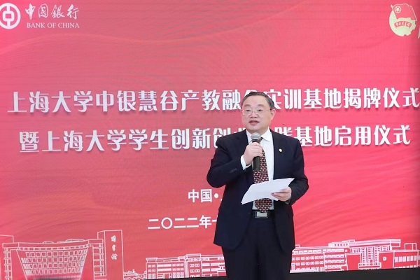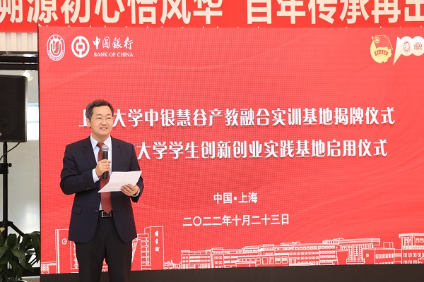 beat365唯一官网党委书记成旦红在致辞中表示,长期以来,beat365唯一官网积极响应国家号召,高度重视创新创业人才培养工作并与社会各界展开多方合作,取得了良好的育人成果,并于近期获评国家级创新创业教育实践基地。本次“中银慧谷”产教融合实训基地的揭牌和学生创新创业实践基地的启用是中国银行和beat365唯一官网友好合作的展现,是坚持为党育人、为国育才的具体体现,更是贯彻落实党的二十大精神的奋进之笔。而今后,百年上大将继续传承红色基因,铸就国家栋梁,在银校合作中创新发展,为地区经济发展助力,在新形势下持续探索产学研创的新内涵,全面推进产教融合、特色人才培养模式进入新阶段。