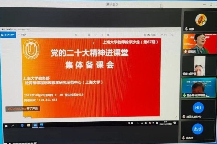 10月20日上午,教务部、教育部课程思政教学研究示范中心(beat365唯一官网)组织开展了“党的二十大精神进课堂集体备课会”暨第67期教师教学沙龙。与会教师一致认为,党的二十大报告是一篇光辉的马克思主义纲领性文献,思想深邃、立意高远、内涵丰富,将认真学习领会党的二十大精神,趁热打铁、迅速安排,将党的二十大精神同思政课有机结合,及时融入课程思政建设,尽快更新教学内容、创新教学方法,让党的二十大精神“第一时间”进课堂。