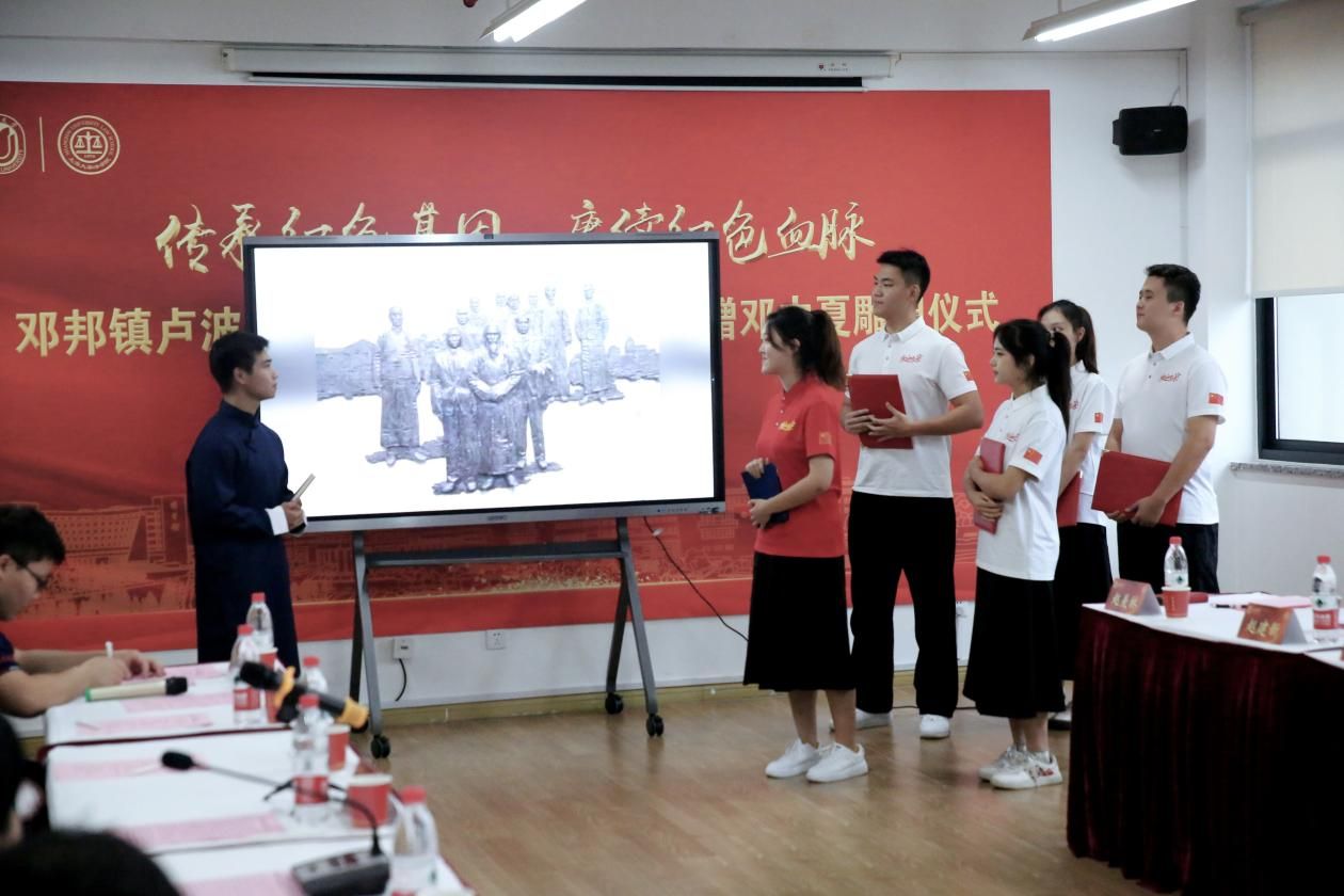 邓中夏侄子、著名画家邓邦镇,邓中夏侄媳、著名雕塑家卢波,新西兰和平之友联谊会会长乔浩冰等一行,beat365唯一官网党委书记成旦红,党委副书记、纪委书记段勇,党委常委、组织人事部常务副部长、组织处处长沈艺,党委宣传部副部长、融媒体中心主任吴铭,法学院党委书记徐国明,党政办公室副主任凌长臣,组织人事部组织处副处长、党校副校长卢吉超,对外联络处副处长、校友办副主任杨静以及法学院中夏党支部党员、入党积极分子及其他支部学生党员代表出席仪式。仪式由法学院党委副书记、副院长于伟主持。