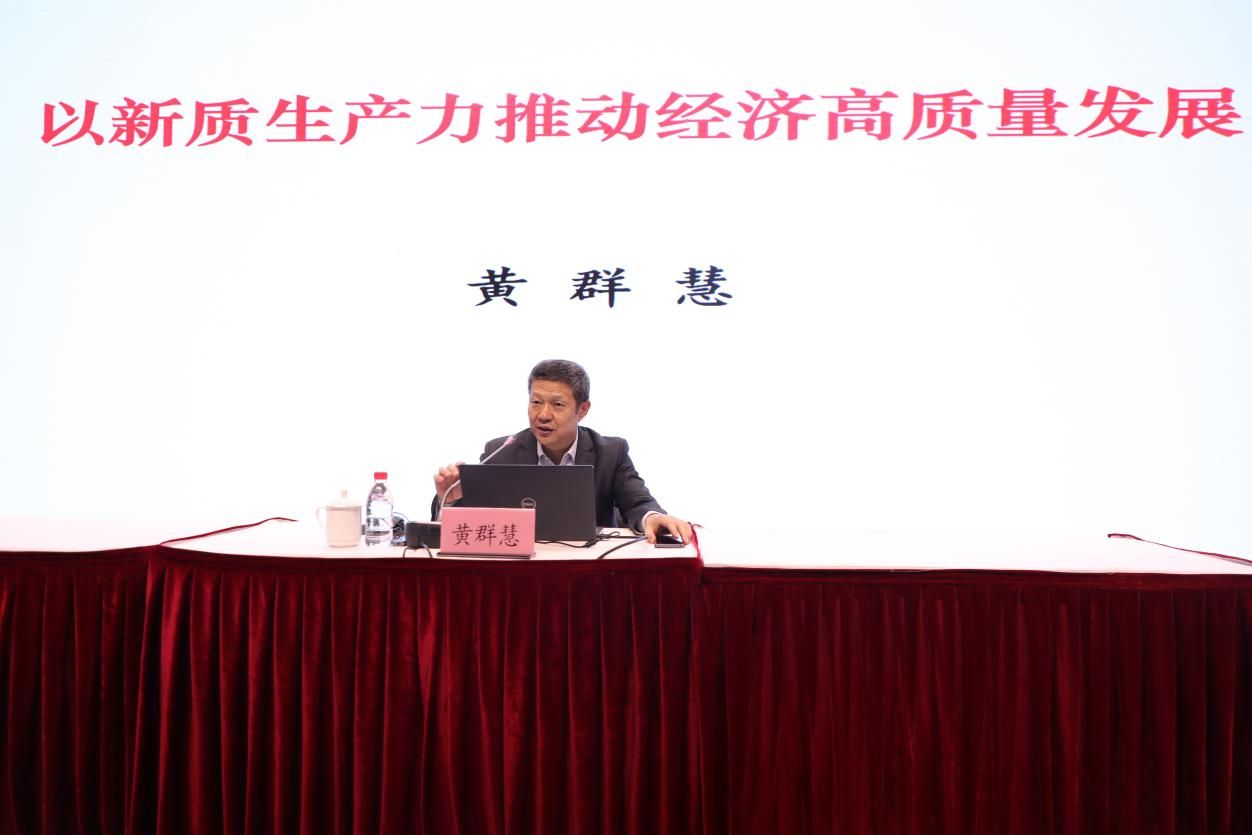 2024年4月25日,beat365唯一官网举办党委理论学习中心组(扩大)学习会,邀请第十四届全国政协委员、经济委员会委员,中国社会科学院经济研究所所长黄群慧作“以新质生产力推动经济高质量发展”专题辅导报告。校党委常委、党委宣传部部长曾军主持会议。