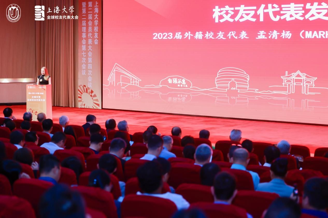 校友代表发言环节,1984级校友、英国校友会会长何其华,1995届校友、山东校友会会长杨向栋,1994届校友、上海日之升科技有限公司总经理陈晓东,2023届外籍校友孟清扬,以及2024届毕业生代表章叶浩薇先后进行发言,分享了他们与母校的感人故事和对母校的深厚情感。