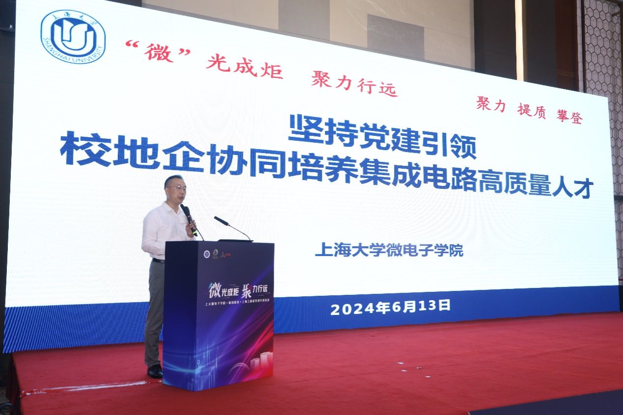 微电子学院党委副书记、副院长袁铭带来主题为《坚持党建引领,校地企协同培养集成电路高质量人才》的主旨演讲。