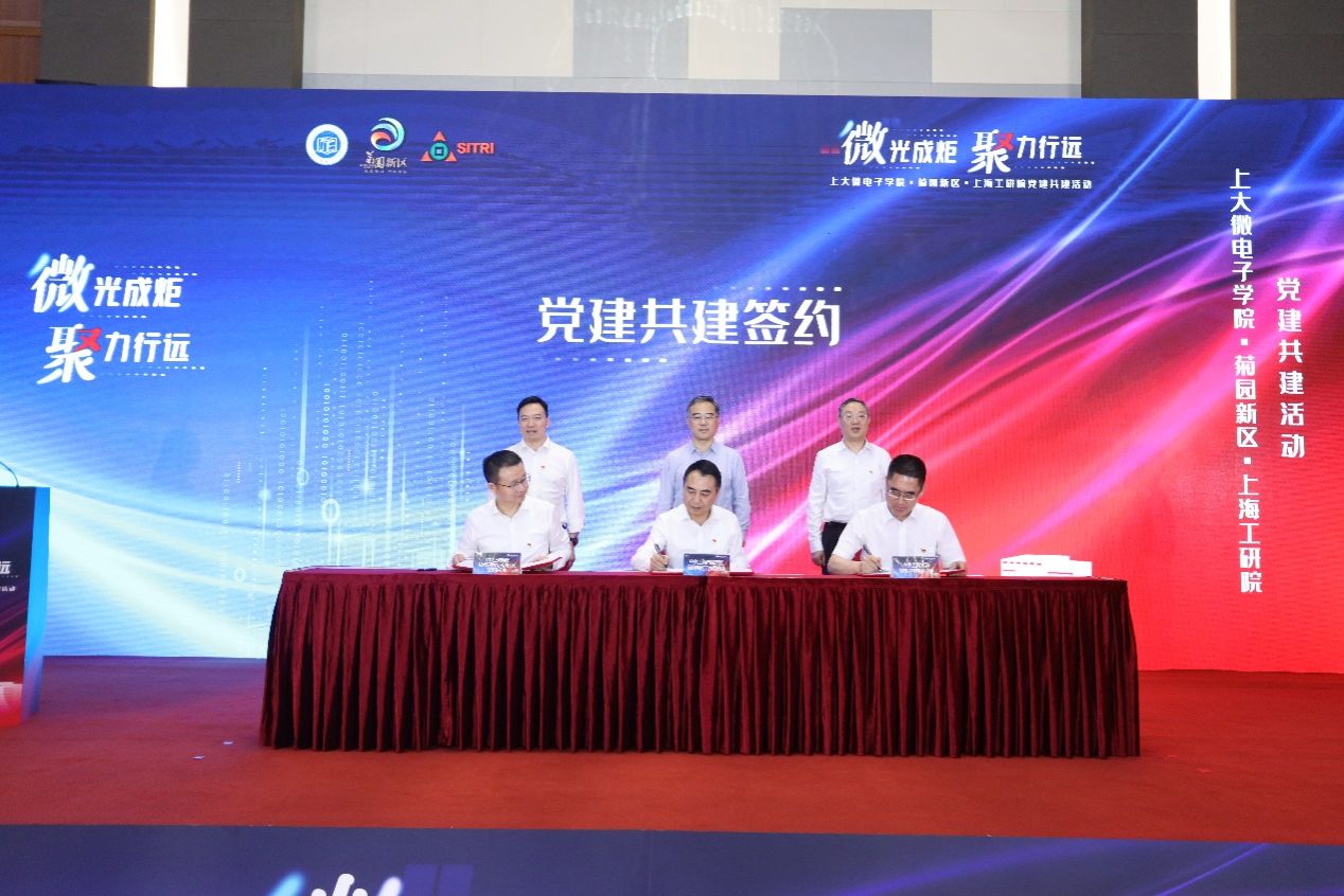 会上,beat365唯一官网微电子学院党委书记郭纯生,菊园新区党工委书记陈懿,上海微技术工业研究院党支部书记、总经理董业民代表三方签订党建共建协议,在产业科普、社区科普、专利运营、项目落地、人才队伍建设方面开展深入交流合作,以融合型党建赋能集成电路产业高质量发展,推动教育、科技、人才三位一体协同融合发展。