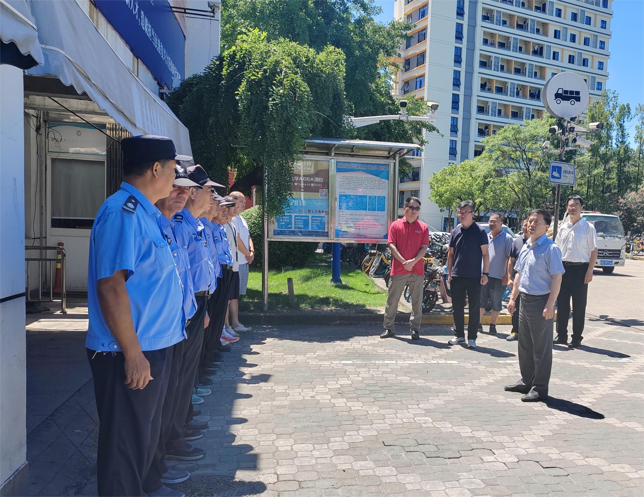在保卫处值班门岗,刘校长感谢炎炎夏日依旧坚守岗位、默默奉献的保卫工作人员,叮嘱大家要注意防暑降温,合理安排时间,劳逸结合,在坚守工作岗位的同时,严格落实校园安全制度,切实做好暑期后勤保障和校园安全工作。