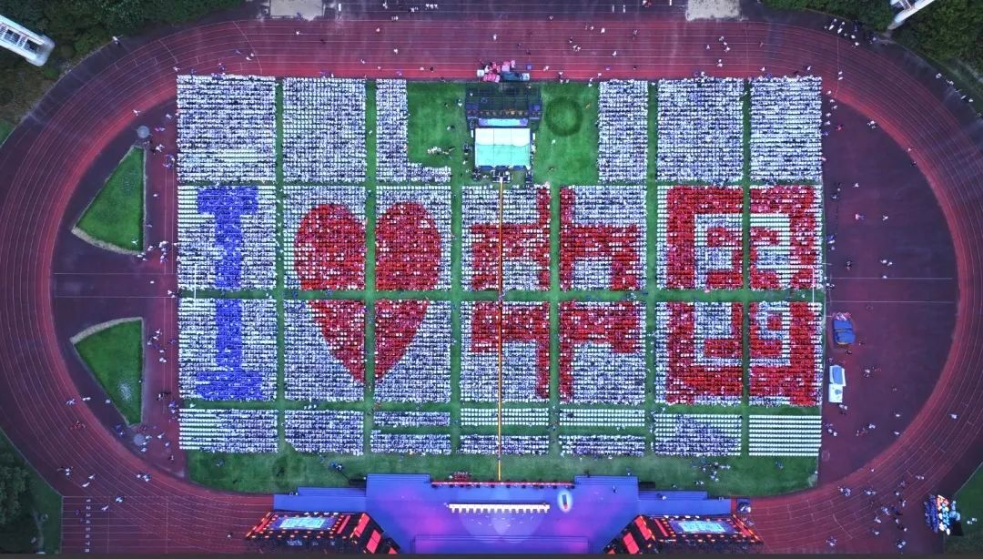 1.2万余名本硕博新生满怀青春热忱,从这里踏上逐梦之旅。他们身着玉兰白、上大蓝、中国红三色新生服,汇聚成一幅“I ❤ 中国”的图案。