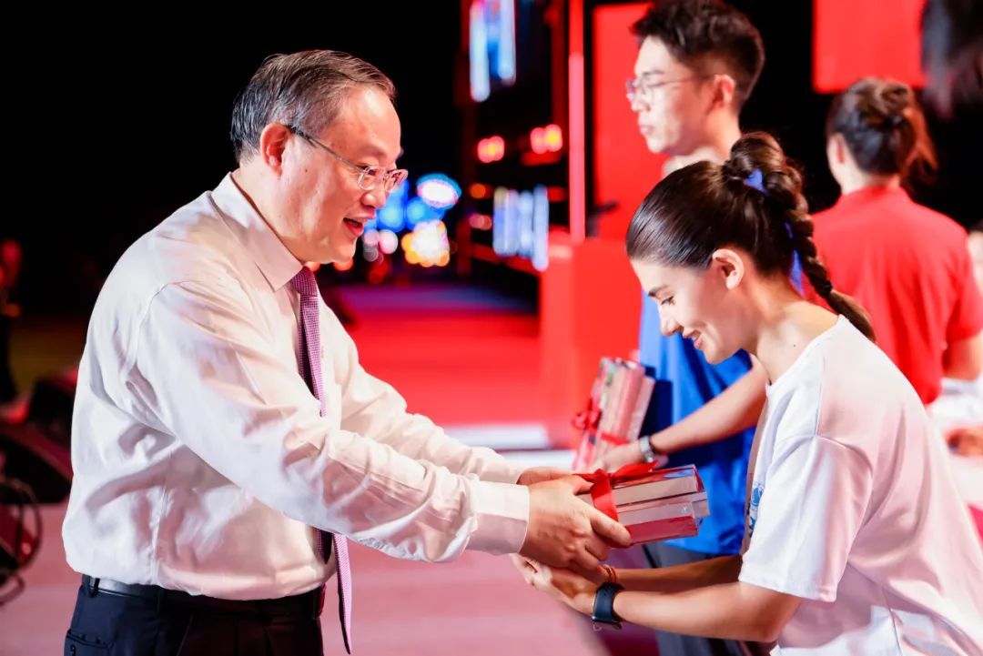 校党委书记成旦红为本科生、研究生、国际生新生代表佩戴校徽并赠送《习近平与大学生朋友们》《百年上大画传》《光荣之城:上海红色纪念地100》《AIGC未来已来迈向通用人工智能时代》等书籍。