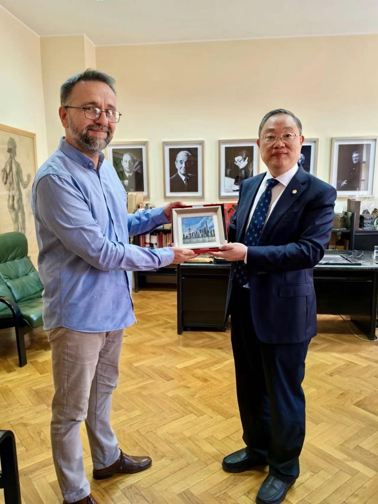 在塞期间,成旦红书记一行还访问了诺维萨德大学,会见了诺大艺术学院院长克拉伊什尼克教授和前院长博坎教授。双方表示将加强电影艺术领域的学术工作坊项目和学生长期交换学习项目合作,双方还就在美术、音乐等更多艺术领域逐步拓展全方位合作达成共识。