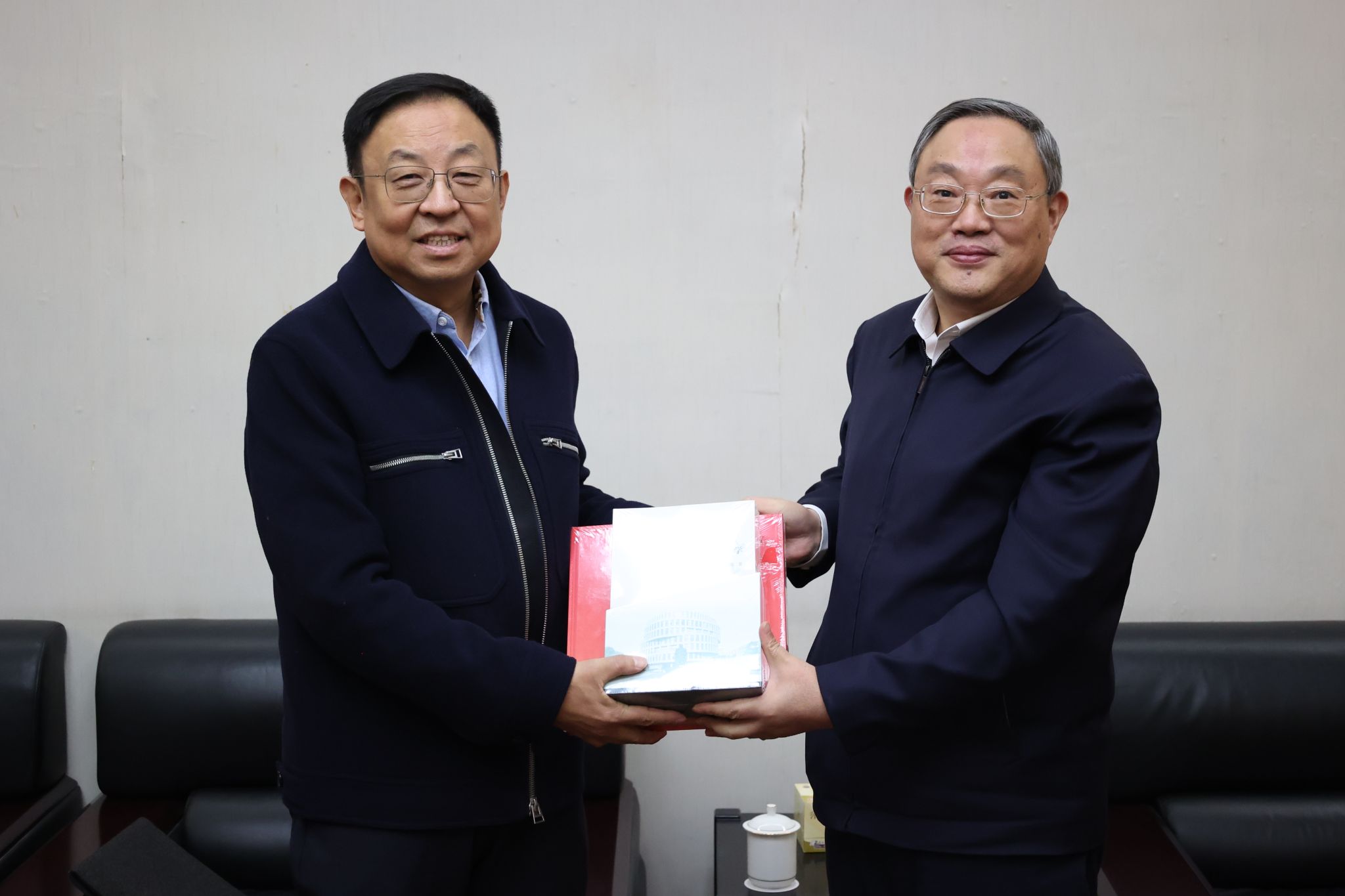 会前beat365唯一官网领导班子成员与楼巍会长亲切交谈,并向楼会长赠送《百年上大画传》等书。