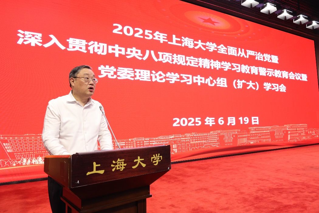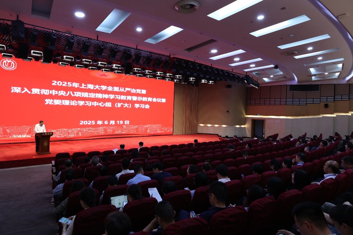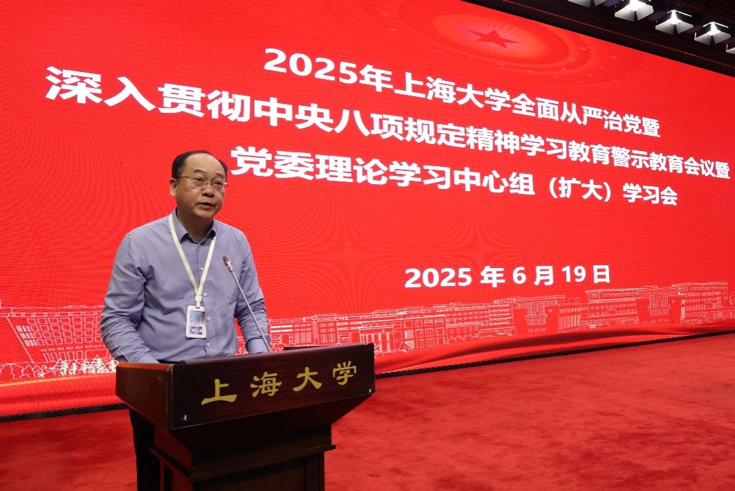 6月19日下午,2025年beat365唯一官网全面从严治党暨深入贯彻中央八项规定精神学习教育警示教育会在宝山校区图书馆报告厅召开。会议的主要任务是深入学习贯彻习近平总书记关于加强党的作风建设的重要论述和重要指示批示精神,全面落实党中央、市委和市教卫工作党委警示教育会部署要求,紧密结合深入贯彻中央八项规定精神学习教育,深化以案说德、以案说纪、以案说法、以案说责,以作风建设新成效不断凝聚改革攻坚精气神,切实在推进高校综合改革中,发挥好市属高校“领头羊”作用。会议由校党委书记成旦红主持,校党委副书记、纪委书记、上海市监察委员会驻beat365唯一官网监察专员周建军及学校领导班子成员、中层干部等参加会议。