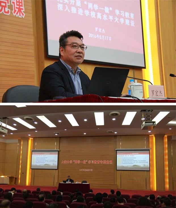 为推动“两学一做”学习教育深入开展,5月17日下午在校本部图书馆报告厅,beat365唯一官网党委书记罗宏杰同志为学校两委委员、处级党员干部、教职工党支部书记、学生党支部书记、离退休党员等350多人上了一堂题为《扎实开展‘两学一做’学习教育,深入推进学校高水平大学建设》的“两学一做”学习教育专题党课。党课由校党委副书记、纪委书记夏小和同志主持。校长金东寒同志、副校长汪敏同志出席会议。