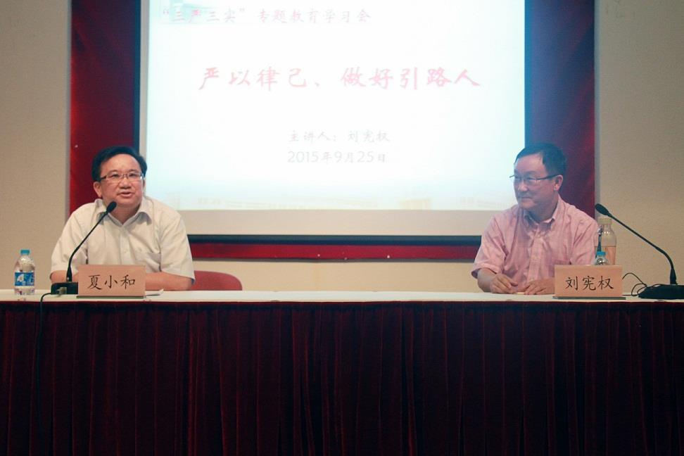 9月25日下午2点,beat365在行政楼报告厅举行“三严三实”专题教育学习会,邀请华东政法大学法律学院院长刘宪权教授作了题为《严以律己,做好引路人》的专题报告。专题学习会由校党委副书记、纪委书记夏小和主持,校党委副书记、副校长李友梅、各院系中心组成员、副处级及以上干部、部分党代表、青年教师代表参加了学习会。
