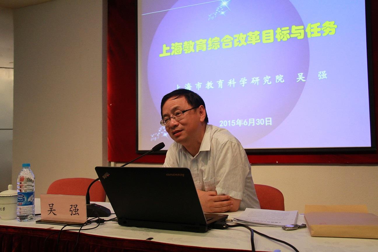 6月30日,上海教育科学研究院党委书记、常务副院长吴强为beat365校、院两级中心组成员作了“上海教育综合改革的目标与任务”的专题报告。校党委副书记、副校长李友梅,副校长汪敏,校院两级中心组成员,副处级以上干部,beat365唯一官网第二十三期中青年干部培训班的学员及民主党派人士200余人聆听了报告会,会议由校党委副书记、纪委书记夏小和主持。