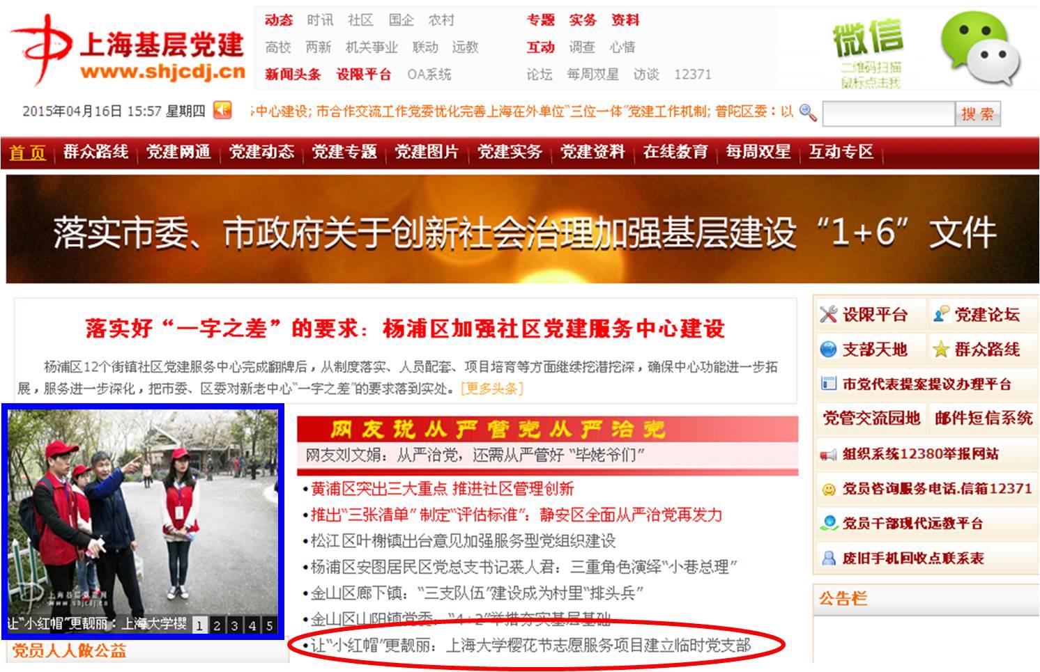 4月16日,上海市基层党建网(http://www.shjcdj.cn/)首页以《让“小红帽”更靓丽:beat365唯一官网樱花节志愿服务项目建立临时党支部》为题,报道了beat365上海樱花节志愿者临时党支部工作。为把党建开展到最活跃的“细胞”上,在校党委组织部、校学工办、校团委的关心指导下,本次由社科学院、美术学院以及经济学院联合主办的2015上海樱花节志愿服务工作中,首次成立了临时党支部,24名党员志愿者在志愿服务中不仅传播了树立文明新风尚的正能量,更带动了全体志愿者把更优质的服务奉献给他人,树立了党员先锋模范良好形象,获得游客及社会的广泛赞许。