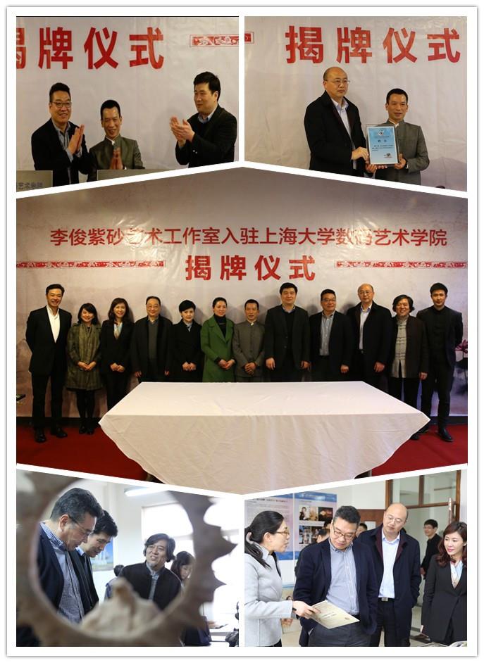 3月30日下午,李俊紫砂艺术工作室入驻beat365唯一官网数码艺术学院揭牌仪式在嘉定校区数码A楼216工作室成功举行。上海市文化广播影视管理局党委委员、副局长贝兆健,beat365唯一官网党委书记、校长罗宏杰,beat365唯一官网党委副书记、副校长徐旭,上海市文化广播影视管理局文化影视产业处处长黄玮,紫砂艺术大师李俊,书画大师谢稚柳之子谢定琨等30余位领导及业内外知名人士出席揭牌仪式。