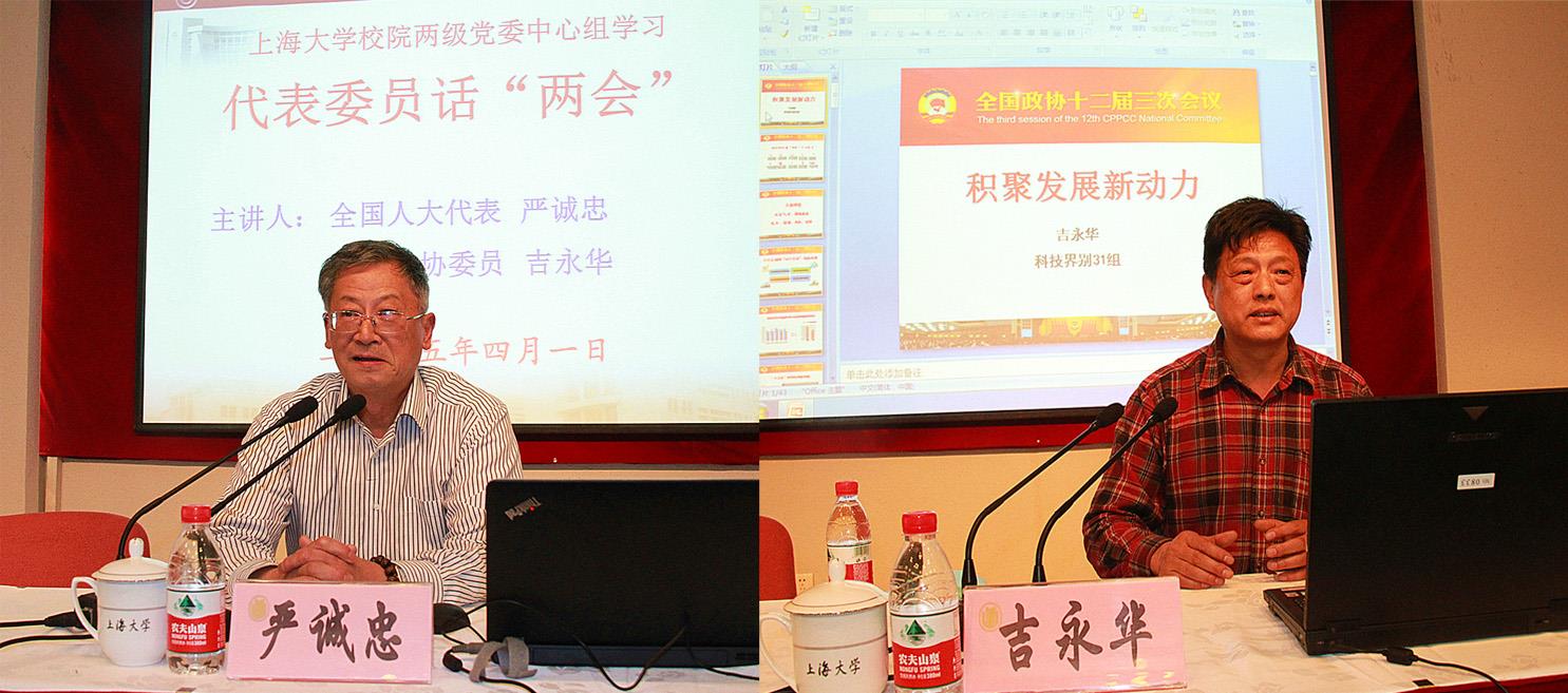 报告会前,夏小和向与会人员传达了习近平总书记3月5日在参加上海代表团审议时所作的重要讲话。随后,严诚忠代表和吉永华委员先后就参加本次“两会”感受到的一些特点、亮点、重点同与大家进行了分享,对全国“两会”精神进行了认真传达。严诚忠向大家阐述了参与本次人代会的主要议程以及习近平总书记参加上海代表团讨论时的情况,就习近平总书记对上海未来发展的期待和要求进行了重点介绍,表示总书记对上海近年来所取得的成果予以充分肯定并寄予厚望,要求上海按照“四个全面”战略布局,凝心聚力、奋发有为,继续当好全国改革开放排头兵、创新发展先行者,为全国改革发展稳定大局作出更大贡献。吉永华则从报告主要内容、科技组联组会议议题等方面介绍了“两会”中政协委员积极参政议政,关注“新常态”的具体情况,尤其对部分政协委员提出的加强智库建设、生态文明建设、科技创新等问题进行了重点介绍。两位代表委员一致认为,参加本次“两会”的最明显感受是近三年来,政府工作越来越细致、严谨,领导核心提出的“问题导向”也使国家的民生问题日益得到关注和解决,两会代表的视野发生了从“国事”到“国是”的变迁,身上肩负的职责也从民情民意的“喇叭”提升为国事国是的“谋士”。
