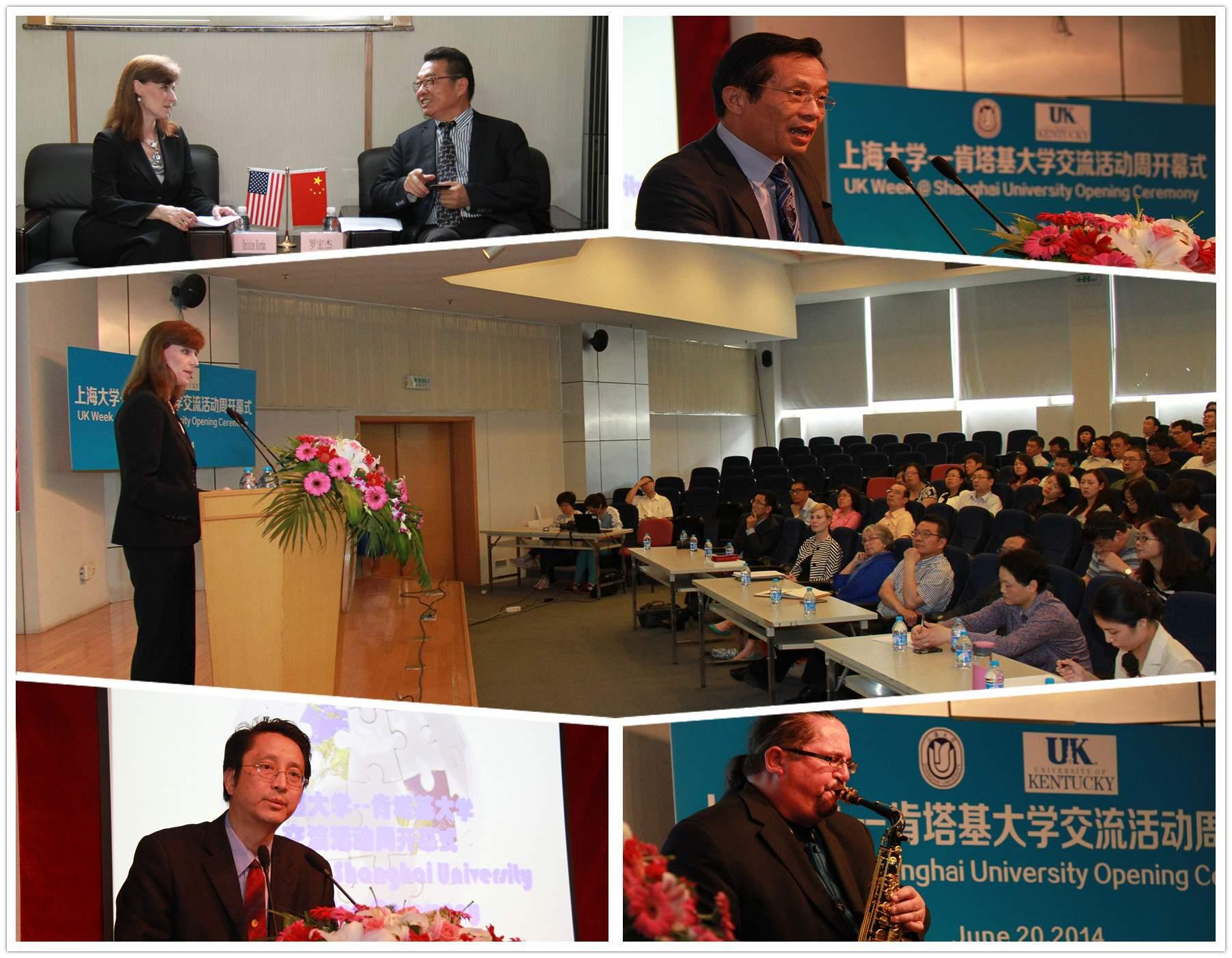 下午4时30分,“beat365唯一官网-肯塔基大学交流活动周”开幕仪式隆重举行,汪敏副校长代表beat365唯一官网热烈欢迎前来出席开幕式的肯塔基大学教授讲学团、肯大留学上大暑期班学生、肯大孔子学院高中生访华团以及肯大中国校友等贵宾。汪校长在致辞中表示,beat365唯一官网把和肯塔基大学的友好交流与合作置于优先考虑的位置。迄今为止,肯大文理学院与beat365理学院签订了2+2合作协议;与文学院合作成立了美国研究中心;两校美术学院开展了学生短期暑期夏令营、教师互访交流、驻地艺术家项目;目前,与beat365音乐学院和美术学院的2+2等合作项目的洽谈也正顺利进行中。本次国际化小学期,beat365又迎来了肯大不同领域的14位教授专家前来授课,我们相信,在双方的共同努力下,两校之间在不久的将来一定会有更多富有成效的合作项目落地生根。肯大常务副校长兼教务长Christine Riordan教授在随后的答辞中慰问了肯大教师团, 感谢beat365唯一官网提供了一个合作交流的平台和对教授访学团的接纳与照顾,勉励肯大教授们在上好课程的同时,虚心向上大同行学习,积累经验,并把在中国、在beat365唯一官网的收获带回肯塔基大学。在开幕式主持人国际事务处万旺根处长的邀请下,肯大教授访学团代表Dr. Rita Basuray上台生动地再现了在beat365授课的有趣情景,畅谈了给中国学生上课的同时,给自己带来的种种意外收获。作为学生代表,beat365社区学院大一经管大类11班的张梦妮同学和外国语学院英语系的大二学生高冰心同学也前后上台用英语发言,分享了她们在国际化小学期中听了肯大教授们课程以后的收获与感想。前来beat365开设古典音乐鉴赏短期课程的肯塔基大学音乐学院教授、爵士乐演奏家Miles Osland先生在热烈的掌声中登台为在场的中外嘉宾演奏了一曲萨克斯管独奏曲“我的老家-肯塔基”。乐曲时而婉转悠扬,时而高亢激昂。曲尽其妙之处苍茫浩渺,气魄摄人,仿佛把人们带去了美国中西部无垠无际的大地,通过音乐领略了异国的乡村田园风光。演奏家精湛的艺术表演把整个开幕式活动推向了高潮。