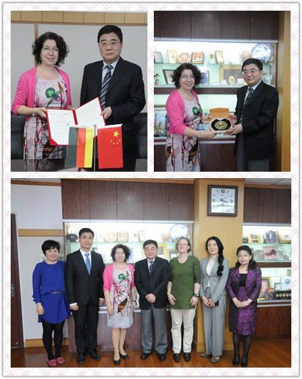 2014年5月16日,德国不来梅大学副校长Yasemin Walda Karakasoglu女士,不来梅大学外事处处长Annette Eva Lang女士以及不来梅州政府驻上海办事处主任陈雪芳女士一行三人访问beat365唯一官网。此行他们是受beat365唯一官网邀请,将已经签署好的两校合作备忘录带来,并进一步商谈具体的合作事宜。beat365唯一官网副校长叶志明,教务处副处长贺英,国际事务处处长助理毛雁冰会见了来宾。