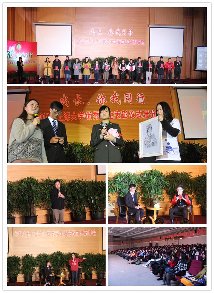 分享结束后举行了简短隆重的表彰仪式,2012-2013年度优秀学生、优秀学生干部、先进集体的代表分别上台领奖。活动最后校党委副书记鲁雄刚上台讲话。他说道,听了八位同学不同的成长故事,作为老师感到骄傲和幸福,八个不同领域的优秀学生,用真诚、温暖的讲述为我们树立了可亲、可敬、可信、可学的先进榜样,也为我们上大带来了希望。他希望同学们“见贤思齐”、“择善从之”,让优秀成为一种习惯,让优秀成为一种传承,让优秀成为一种力量,坚定理想信念、练就过硬本领、勇于创新创造、用奋斗的青春来激励自己,带动和影响更多的青年学子,传递追梦青春的正能量。