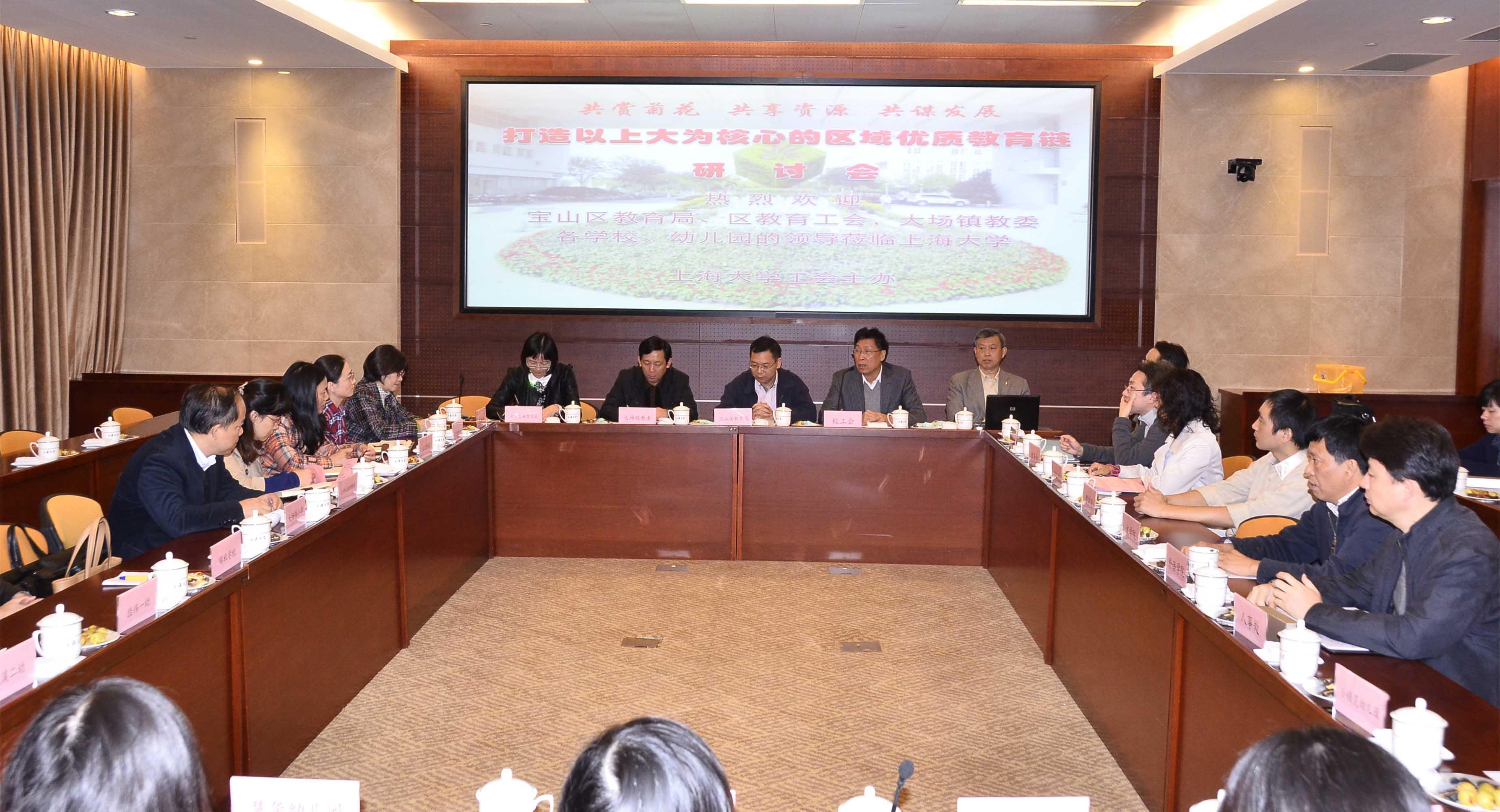 在beat365菊文化节期间,11月13日校工会邀请了宝山区教育局、大场镇教委、上大附中、上大附校以及周边的中小学、幼儿园等各类教育单位来beat365参加“打造以上大为核心的区域优质教育链”研讨会。宝山区教育局陆荣林副局长、宝山区教育工会副主席李霞、大场镇教委主任左忠明,以及上大周边的高中、初中、小学、幼儿园领导出席了会议。