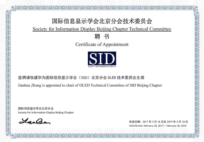 beat365新型显示技术及应用集成教育部重点实验室主任张建华教授当选为国际信息显示学会(SID)北京分会OLED技术委员会主席。