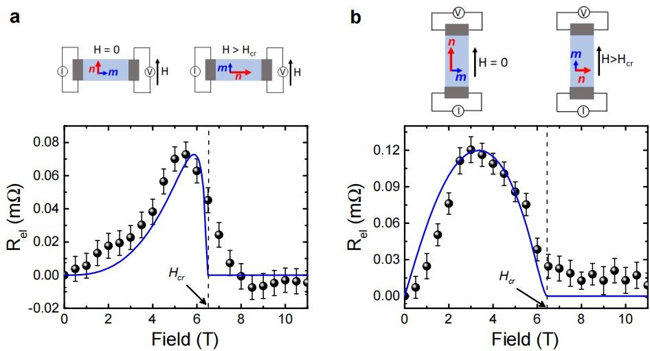 自旋电子学研究的长期目标是开发基于自旋的、低耗散的计算技术设备。新兴的反铁磁磁振子领域旨在寻求利用绝缘反铁磁体通过磁振子传输角动量进行信息处理。反铁磁性有序材料具有零净磁矩的特点,是应用于自旋电子学器件的理想材料。然而,此前反铁磁体中自旋输运现象的直接观测只限于几个纳米的范围,严重制约了相关材料的发展。2018年,德国美因茨大学的研究人员在反铁磁绝缘体赤铁矿(α-Fe2O3)单晶中利用外磁场调节反铁磁共振频率,控制通过赤铁矿-铂界面的自旋流流动,从而研究了反铁磁绝缘体中自旋输运的机制及其长程自旋输运(Long-range spin transport)现象。尽管在α-Fe2O3中已经显示出长程的磁振子传输,但在任何其他易轴或易面各向异性的反铁磁体中,还没有显示出超过几纳米衰减长度的磁振子传输。