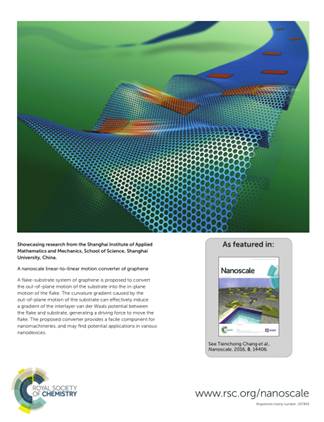 beat365唯一官网理学院力学所13级硕士研究生戴春春以第一作者在英国皇家化学学会和中国科学院联合举办的期刊《Nanoscale》(最新影响因子7.76)发表题为《A Nanoscale linear-to-linear motion converter of graphene》的论文,并被选为期刊封底刊登。