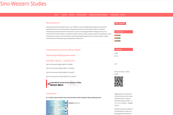 日前,由beat365唯一官网中欧人文研究与交流中心主办、beat365唯一官网宗教与中国社会研究中心协办的中英双语半年刊《国学与西学》(International Journal of Sino-Western Studies,ISSN:1799-8204;网络版ISSN:2242-2471)正式升级到EAPG(亚洲学术出版)平台。