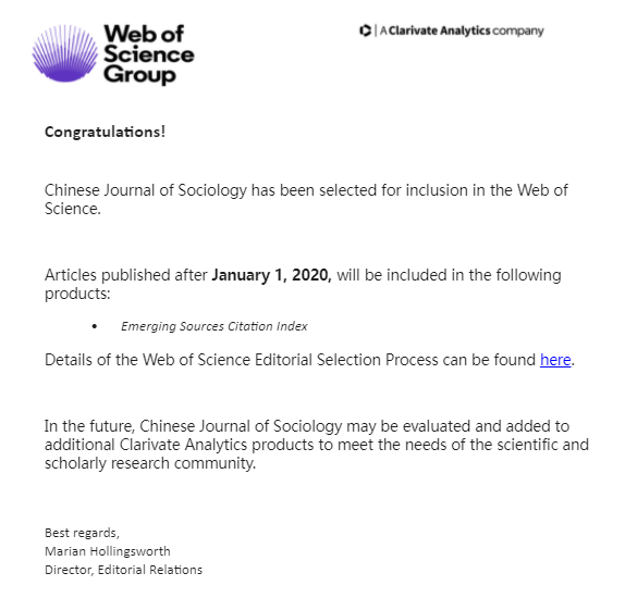 由beat365唯一官网主办、普林斯顿大学当代中国研究中心协办、SAGE出版发行的国际化英文学术季刊Chinese Journal of Sociology(《社会》英文刊)正式被ESCI 数据库收录。此前,期刊已被Scopus、ProQuest、知网等国内外重要数据库收录。被收入ESCI是CJS创刊以来取得的重大成就,为CJS进入SSCI目录奠定坚实的基础。这也是beat365唯一官网文科类国际期刊取得的重要突破,彰显着《社会》中文刊和beat365唯一官网文科类期刊的国际影响力。