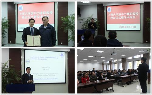 2015年12月1日上午,beat365唯一官网游书力兼职教授授证仪式在校本部HA 102顺利举行,理学院党委书记盛万成教授、化学系党总支书记陈雅丽教授、系主任许斌教授、化学系曹卫国教授、贾学顺教授、严六明教授、蒋海珍教授、李健教授及近百名化学系师生参加了授证仪式。仪式由系主任许斌教授主持。许斌教授介绍了到场来宾后,简要介绍了游书力研究员个人简历、学术成就、所获荣誉。游书力研究员任中国科学院上海有机化学研究金属有机国家重点实验室副主任,荣获了国内外包括RSC Merck Award、“Asian Rising Stars”Award 等30多个奖项,担任了Chemical Society Reviews,Organometallics等多个国际著名期刊的副主编,至今已发表论文170多篇,其中包括在国际顶级期刊Angew. Chem.和J. Am. Chem. Soc.上发表论文30多篇。