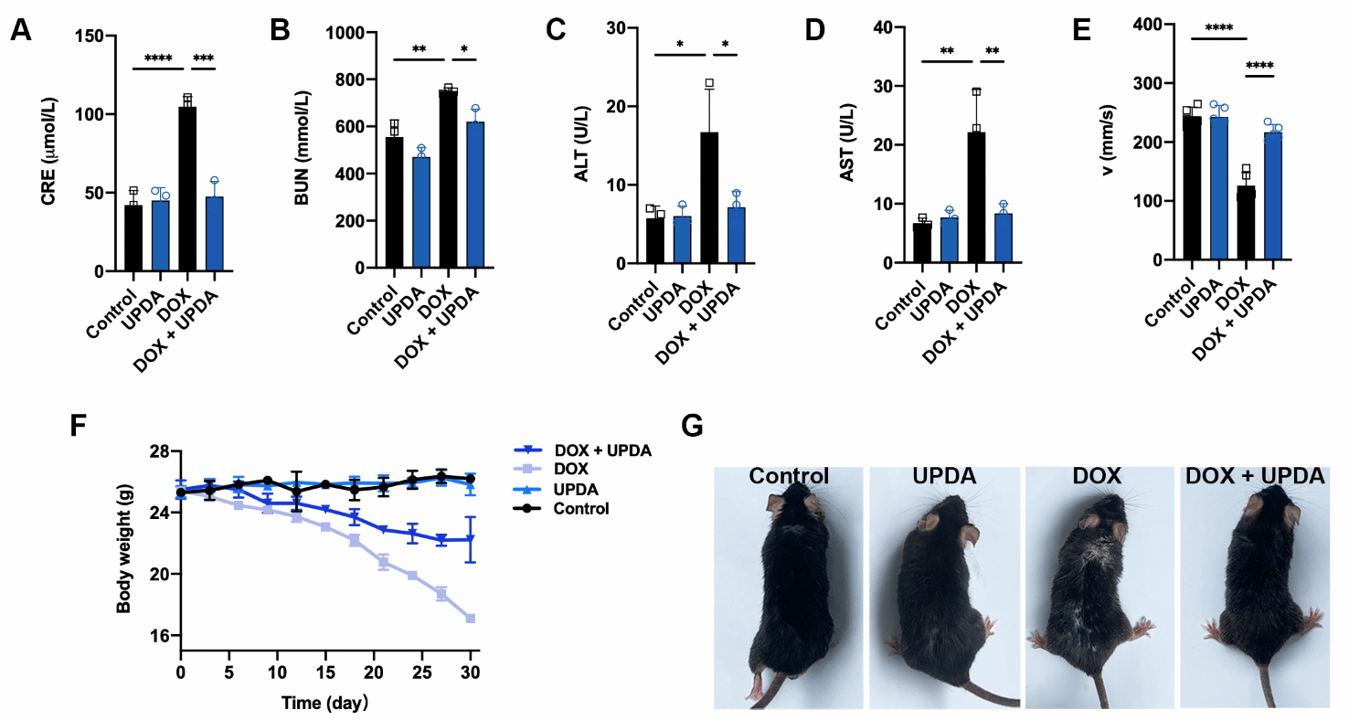 首先通过液相剥离技术合成了UPDA NPs。发现该纳米颗粒具有过氧化氢酶和过氧化物歧化酶的酶活性,可以有效清除多种活性氧自由基和活性氮自由基。并通过一系列体外体内实验证明UPDA NPs具有保护细胞抵抗DOX、H2O2、D-gal诱导的氧化应激的能力,可以恢复小鼠衰老相关的肾功能、组织稳态、毛发密度和运动能力。