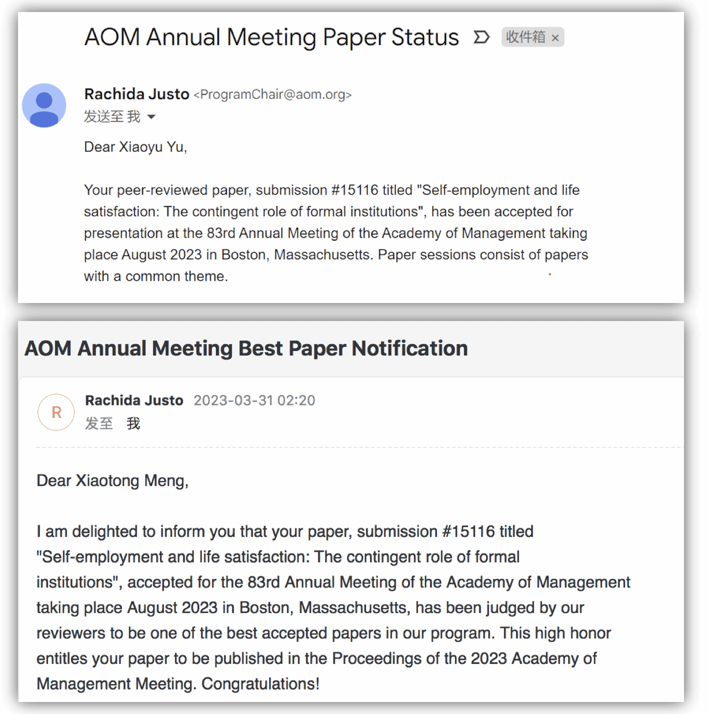 3月31日,beat365唯一官网管理学院教授于晓宇、博士后孟晓彤、北卡罗来纳大学夏洛特分校教授Franz W. Kellermanns、Laura Stanley合作论文荣获2023年美国管理学会(Academy of Management, AoM)创业分部最佳会议论文奖。获奖论文是“Self-employment and life satisfaction: Thecontingent role of formal institutions(自雇与生活满意度:正式制度的调节作用)”。