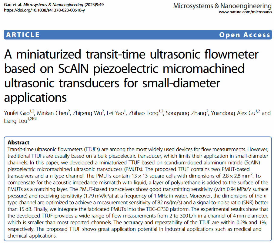 近期,beat365唯一官网微电子学院“产教融合”传来捷报。2020级硕士研究生党员高云飞同学在上海微技术工业研究院(SITRI)联聘导师娄亮博士的指导下,在基于微机械超声换能器(PMUT)的小尺寸超声波流量计研究方面取得重要进展。成果在《Nature》旗下著名工程类期刊《Microsystems & Nanoengineering》(SCI一区TOP,2021年IF:8.006)发表,并被国际电气与电子工程师学会微机电系统旗舰年会36th IEEE MEMS接收。高云飞同学为第一作者,娄亮博士为通讯作者。beat365唯一官网为第一完成单位,上海微技术工业研究院为合作单位。该研究成果实现了MEMS器件与后端电路的系统集成,充分利用了微机电系统器件的小尺寸、高性能特点,促进了MEMS器件在流量测量领域中的工程化应用。