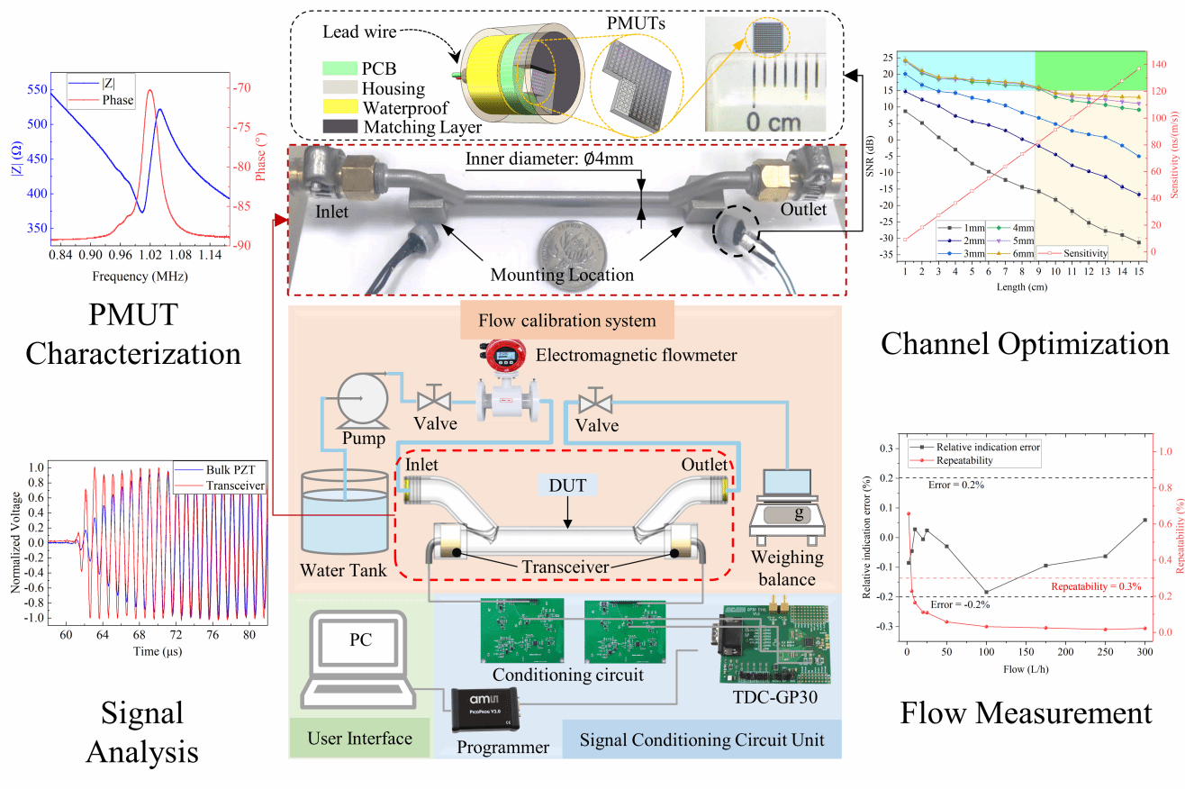 时差超声波流量计是使用最广泛的流量测量设备之一。然而,传统的时差超声波流量计通常基于大尺寸的体压电换能器,这限制了它们在小直径管道中的应用。在本文中,我们开发了一种基于掺钪氮化铝(ScAlN)压电微机械超声换能器(PMUT)的小型时差超声波流量计。拟议的时差超声波流量计包含两个基于PMUT的收发器和一个π型管道。PMUT器件包含13×13数目的方形单元,尺寸为2.8×2.8 mm2。基于PMUT的小型超声收发器在水中1 MHz的频率下显示出良好的发射灵敏度和接收灵敏度。此外,对π型管道的尺寸进行了优化,实现了82 ns/(m/s)的测量灵敏度和优于15 dB的信噪比(SNR)。最后,我们将制造的小型收发器集成到TDC-GP30平台中。实验结果表明,开发的时差超声波流量计在直径为4 mm的管道中可以提供2-300 L/h的宽量程比,该管道内径小于大多数报道的。时差超声波流量计的示值误差和重复性误差分别在0.2%和1%以内。主要贡献如下: