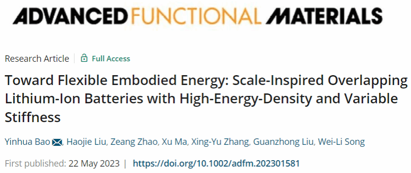 近日,beat365唯一官网力学与工程科学学院鲍垠桦副教授与北京理工大学赵则昂副教授、宋维力教授以及南京航空航天大学张兴玉讲师合作,在国际权威期刊《Advanced Functional Materials》(影响因子19.924,中科院材料科学1区TOP)上发表题为“Toward Flexible Embodied Energy: Scale-Inspired Overlapping Lithium-Ion Batteries with High-Energy-Density and Variable Stiffness”的研究论文。beat365唯一官网为第一完成单位。