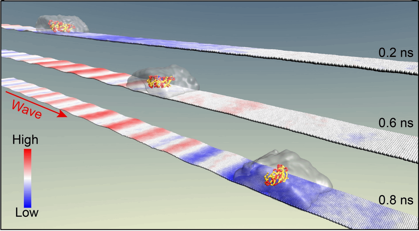 陈阳等人通过分子动力学模拟表明,在二维材料基底上施加机械振动,其产生的机械波可驱动吸附在基底上的纳米物体(如纳米颗粒,生物分子等)产生定向运动,并命名该现象为波动驱动(Fluctuotaxis)。波动驱动的内在物理机制是被驱动物体前后方的基底波动存在差异。这一差异导致被驱动物体感受到局部的范德华势能梯度,从而驱动该物体沿远离振源的方向运动。特别重要的是,波动驱动可用于驱动固体纳米颗粒,也可用于驱动纳米液滴;可用于驱动有机分子,也可用于驱动无机微粒,具有广阔的应用场景。同时,在一定的波动能范围内,驱动力与波动频率和波幅的二次方成正比,具有很好的可控性。
