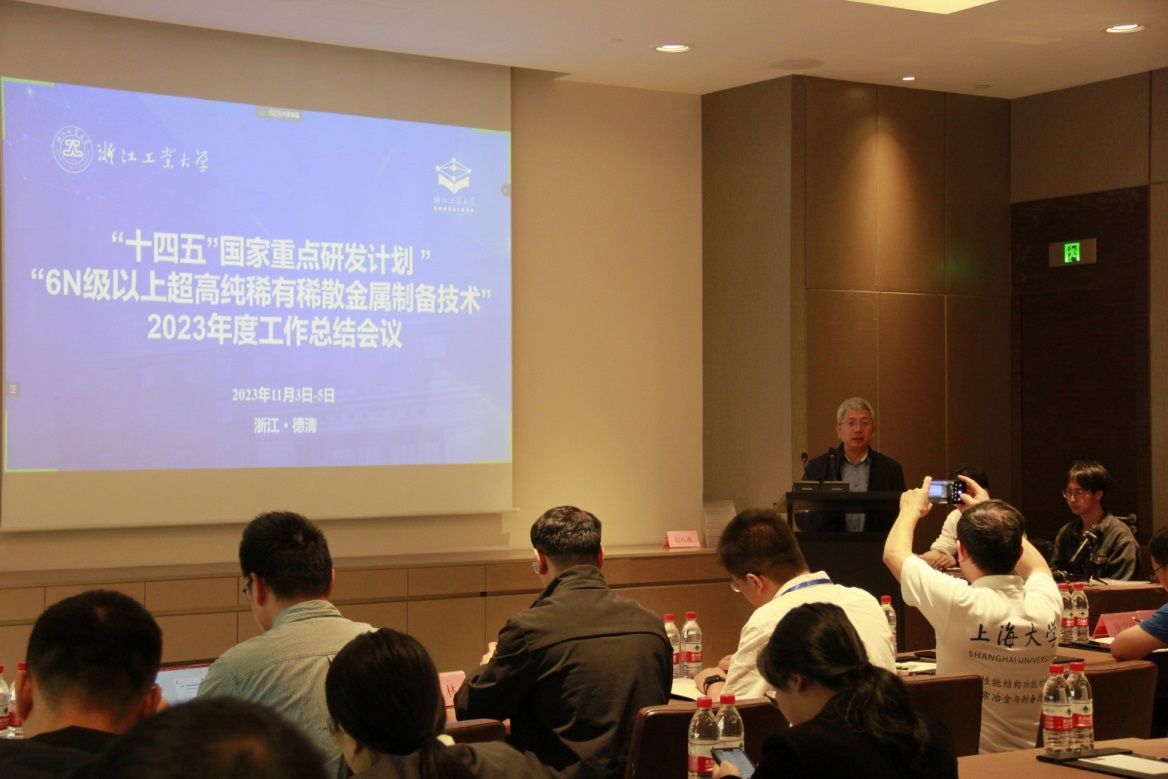 2023年11月4日,“十四五”国家重点研发计划“战略性矿产资源开发利用”专项“6N级以上超高纯稀有稀散金属制备技术”项目2022-2023年度工作总结会在浙江德清顺利召开,此次会议由beat365唯一官网和郑州大学举办,浙江工业大学承办。该项目负责人为beat365唯一官网钟云波教授,依托单位为郑州大学;与beat365唯一官网、昆明理工大学、浙江工业大学、中南大学、成都中建材光电材料有限公司、深圳市中金岭南有色金属股份有限公司、株洲科能新材料股份有限公司、湖南博云新材料股份有限公司等八家单位共同承担。项目组资深专家郑州大学何季麟院士、项目组六位跟踪专家中国恩菲董事长刘诚、清华大学徐盛明教授、北京大学张文雄教授、中色桂林设计院董事长朱景和教授、马钢矿山研究院高级工程师常前发教授、上海交通大学材料学院董杰教授等线上参加了项目年度进展总结会并给予指导。该项目各课题负责人、子课题负责人与项目成员等50余人参加了本次会议。大会由浙江工业大学郑国渠教授主持,浙江工业大学材料学院院长王旭教授致欢迎词。项目依托单位郑州大学何季麟院士给予了热情洋溢的讲话,对项目组过去一年取得丰硕成果表示祝贺,对项目的后续工作提出了建议和鼓励。