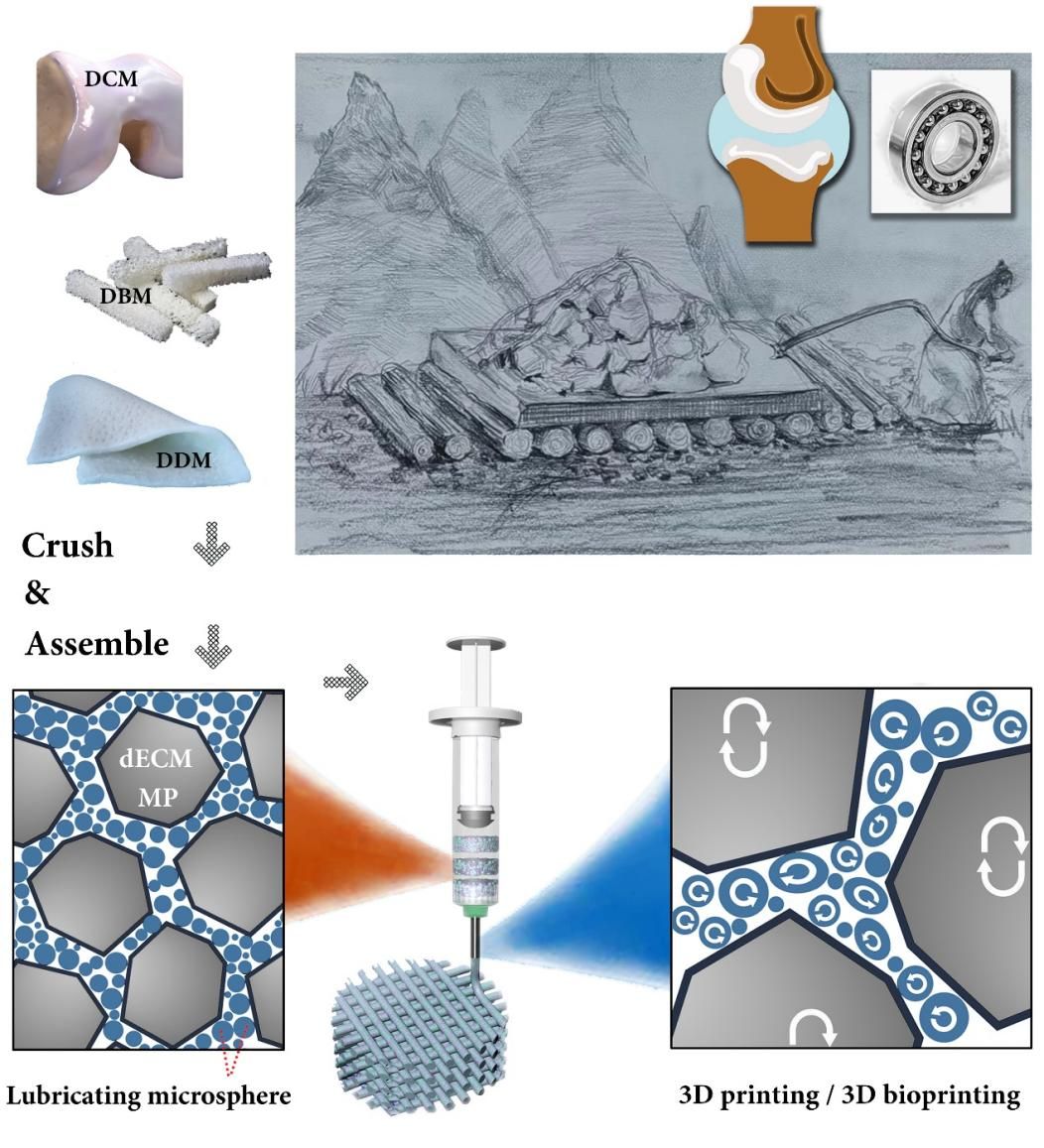 近日,根据颗粒润滑和关节润滑的原理,beat365唯一官网材料科学与工程学院高分子材料系的张坤玺副教授、尹静波教授团队建立了一种高效、通用的、可用于3D打印的高含量dECM微颗粒基异质性颗粒墨水的制备方法,研究成果发表在高水平期刊《Advanced Functional Materials》(影响因子:19.000),论文题目为“Lubricating Micro-Interface Assisted General Strategy for PreparingdECM-Microparticle–Based Heterogeneous Granular Inks toward 3D Printing”,beat365唯一官网为第一作者和第一通讯作者单位,同济大学附属同济医院、中国人民解放军海军军医大学为合作单位。