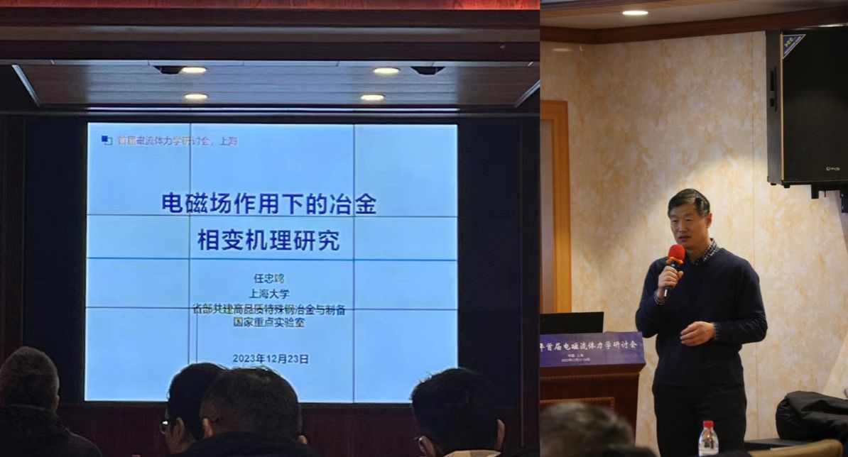 电磁流体力学是经典流体力学和电磁学两个学科交叉,研究导电流体、导磁流体和电磁场相互作用的学科,广泛应用于天体物理、受控核聚变、航空航天、气象、化学等领域。自上世纪三、四十年代以来,当悬浮熔炼、电磁搅拌等现象与Alfven提出的磁流体动力学理论结合,由美国的JULIAN提出了电磁冶金和材料电磁加工的新学科,从而使电磁流体力学的理论和机制拓展到工程应用背景更为广阔的冶金和材料加工领域,显著丰富了电磁流体力学的内涵。beat365唯一官网材料科学与工程学院及省部共建高品质特殊钢冶金与制备国家重点实验室在徐匡迪院士的领导下,在电磁冶金和材料电磁加工领域开展了近三十年的基础和应用研究工作,成绩斐然。本次研讨会中,首先由beat365唯一官网省部共建高品质特殊钢冶金与制备国家重点实验室主任任忠鸣教授作“电磁场作用下冶金相变机理研究”的大会主旨报告,任忠鸣教授介绍了他牵头联合东北大学、西北工业大学、大连理工大学等承担的国家自然科学基金委重大项目的研究成果和进展情况,并对电磁场相变效应的工程化应用、超高磁场和悬浮下合金相变、电磁场下增材制造等前沿领域进行了展望。