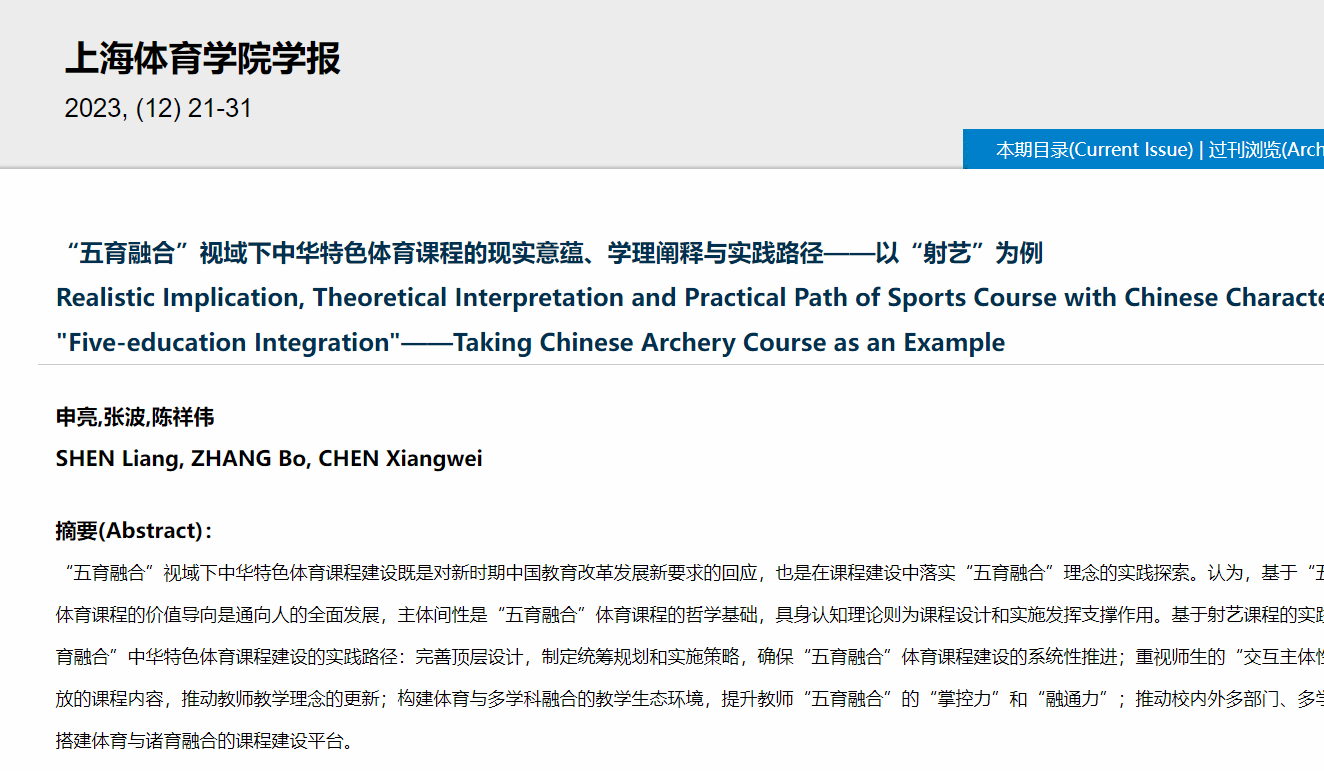 最近,体育学院申亮副教授团队在《上海体育学院学报》发表高质量教学研究成果《“五育融合”视域下中华特色体育课程的现实意蕴、学理阐释与实践路径——以“射艺”为例》。研究认为:“五育融合”视域下中华特色体育课程建设既是对新时期中国教育改革发展新要求的回应,也是在课程建设中落实“五育融合”理念的实践探索;基于“五育融合”的中华特色体育课程的价值导向是通向人的全面发展;主体间性是“五育融合”体育课程的哲学基础;具身认知理论则为课程设计和实施发挥支撑作用。基于射艺课程的实践探索,研究提出实现“五育融合”中华特色体育课程建设的实践路径:完善顶层设计,制定统筹规划和实施策略,确保“五育融合”体育课程建设的系统性推进;重视师生的“交互主体性”作用,设计动态开放的课程内容,推动教师教学理念的更新;构建体育与多学科融合的教学生态环境,提升教师“五育融合”的“掌控力”和“融通力”;推动校内外多部门、多学科协同合作,多主体搭建体育与诸育融合的课程建设平台。
