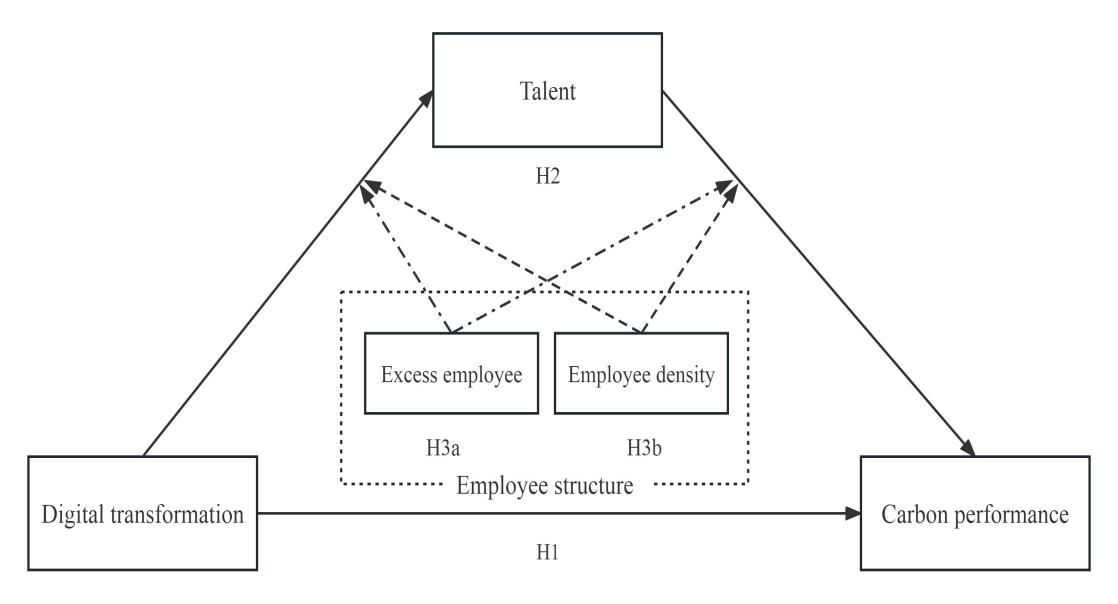 此项研究有三个主要贡献:第一,数字化对碳减排会产生怎样的影响,目前还没有统一的结论,且现有文献主要围绕具体产业进行研究。此项研究在动态能力理论分析的基础上,在微观层面上发现了数字化转型对碳绩效的正向影响。第二,现有研究较多关注技术创新在数字化转型和碳绩效之间发挥的中介作用,此项研究发现了人才在数字化转型和碳绩效之间的中介作用。由于吸收能力可以通过人才反映出来,证实了吸收能力在提高碳绩效方面的价值,从而丰富了吸收能力理论。第三,现有文献缺乏数字化与碳减排的调节作用机制的研究,此项研究引入了超额雇员和员工密集度两个调节变量,揭示它们对人才中介作用的调节,扩展了人力资源管理理论。