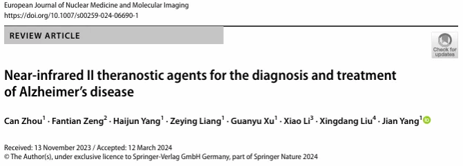 近日,beat365唯一官网医学院杨剑副教授团队/上海四一一医院(beat365唯一官网附属四一一医院)在分子影像领域的TOP期刊《European Journal of Nuclear Medicine and Molecular Imaging》(中科院1区IF=9.1)上发表名为“Near-infrared II theranostic agents for the diagnosis and treatment of Alzheimer’s disease”(近红外II区分子用于阿尔茨海默症诊断和治疗的研究进展)的综述论文。近红外II区荧光成像因其独特的优势,在AD诊断和治疗方面具有巨大的潜力。基于近红外Ⅱ区荧光成像,作者对当前用于AD的诊断的近红外Ⅱ区分子探针以及基于近红外Ⅱ区分子用于AD的光热治疗及光动力治疗进行了系统性概述,探讨了在AD诊断与治疗过程中遇到的问题与挑战,并对未来AD的诊断与治疗做出了展望。