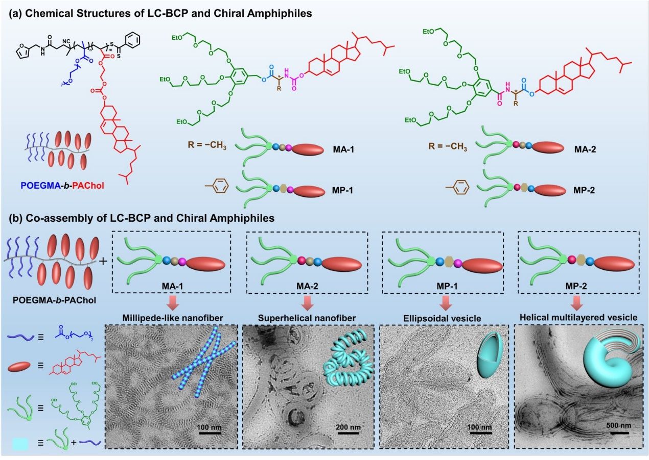 该研究工作发展了一种新型协同共组装策略,通过将液晶嵌段共聚物(LC-BCP)与不同手性双亲分子进行共组装,成功制备了具有手性特征的“千足虫”状纳米纤维、超螺旋纤维、椭球囊泡以及超螺旋多层囊泡等多种层级组装结构(图1)。通过这种共组装策略,嵌入到LC-BCP中的手性双亲分子不仅实现了对液晶排列有序度的精准调控,而且促进了组装体结构不对称性的有效传递和放大。此外,双亲分子中氨基酸疏水侧基的改变实现了共组装结构由一维纤维到三维囊泡的转变,而氨基酸的连接顺序则是调节组装结构螺旋化的关键。该论文深入探讨了聚合物与手性小分子的共组装行为,研究结果进一步丰富了人们对手性层级表达和调控的理解,尤其是不对称性放大与纳米结构转变之间的关系。这些研究为构建功能层级纳米材料以及纳米结构的精准调控提供一个新的思路。