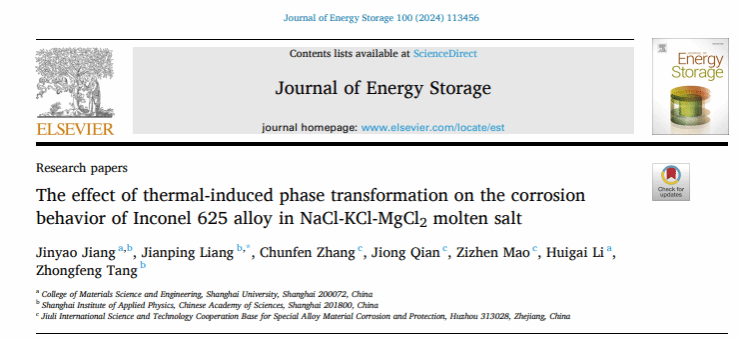 beat365唯一官网先进凝固技术中心团队联合中国科学院上海应用物理研究所,首次发现“热诱导相变”在熔盐腐蚀过程中起到关键作用,结果发表在Journalof EnergyStorage(中科院二区top,IF9.4)上。研究成果以“The effect of thermal-induced phase transformation on the corrosion behavior of Inconel 625 alloy in NaCl-KCl-MgCl2 molten salt”为题,论文第一作者为姜金耀硕士研究生,指导老师为中国科学院上海应用物理研究所梁建平正高级工程师、beat365唯一官网CAST团队李慧改教授。审稿人评价:It is interesting and a good future study to inhibit thermal-induced phase transformation of the alloy for improvement of mechanical property and corrosion resistance property in molten salt.