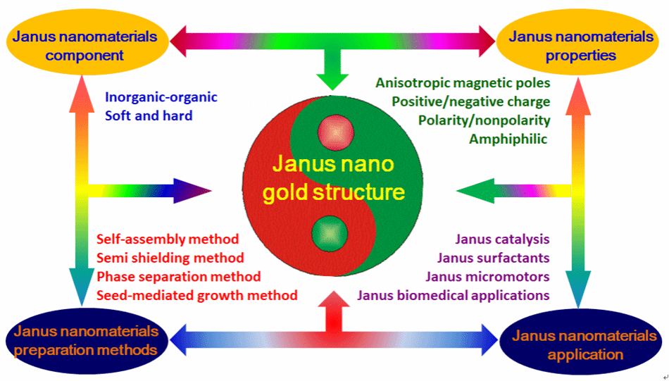 Janus材料用于描述一类在同一介观微粒中具有两个相对成分及其化学或物理特性的材料,包含具有相反性质的双成分,如亲水/疏水、极性/非极性、各向异性磁极和正电荷/负电荷等。Janus金纳米材料在新型双功能材料的开发中具有重要意义,因其优异的生物特性、稳定性和等离子体效应而受到广泛关注。