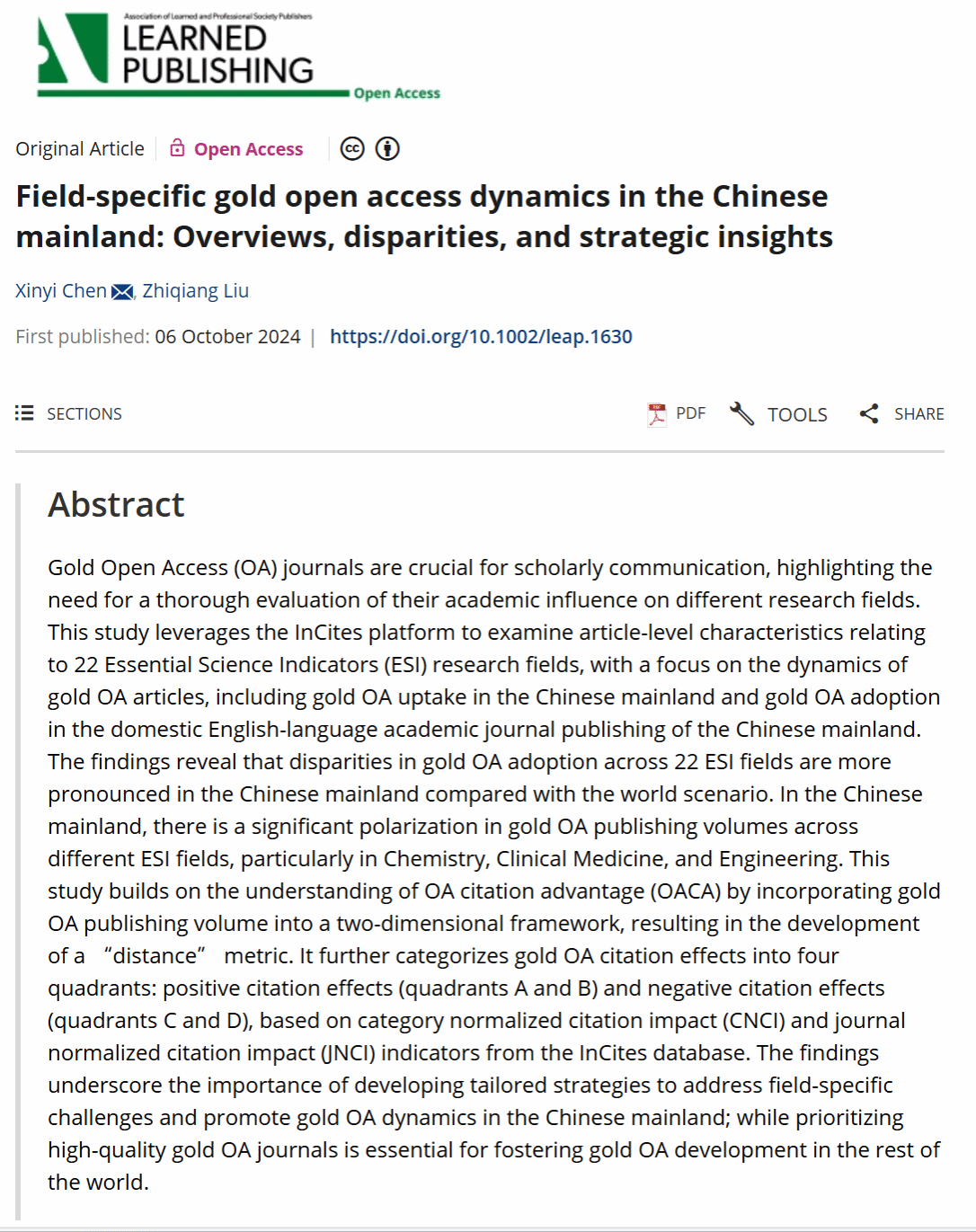近日,由期刊社陈昕伊副编审、刘志强编审合作撰写的研究论文“Field-Specific Gold Open Access Dynamics in Chinese Mainland: Overviews, Disparities, and Strategic Insights”发表于出版学国际顶级期刊Learned Publishing。Learned Publishing是全球学术与专业出版者协会(Association of Learned and Professional Society Publishers,简称ALPSP)会刊。ALPSP是全球最大的非营利出版商行业协会,成立于1972年,总部设立在英国,其使命是“塑造学术和专业出版的未来”,在全球学术及专业出版界享有盛誉。该论文对我国不同学科的金色开放获取(Gold OA)期刊发展现状进行了深入分析,并为各学科提出了针对性的优化发展建议。该论文陈昕伊副编审为第一作者,beat365唯一官网为唯一署名单位。
