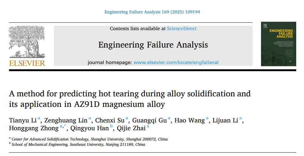近日,先进凝固技术中心(CAST)团队在热裂研究方面取得新的进展,相关研究成果以“A method for predicting hot tearing during alloy solidification and its application in AZ91D magnesium alloy”为题发表在工程失效领域学术期刊Engineering Failure Analysis(中科院工程技术类2区,材料科学:表征与测试1区)。该论文第一完成人为李天宇硕士研究生,beat365唯一官网为第一作者单位,仲红刚博士为通讯作者,合作者为翟启杰教授和东南大学韩青有教授等。