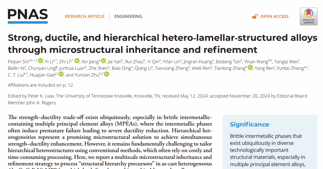 近日,beat365唯一官网材料学院钟云波教授领衔的高性能结构功能材料超常冶金与制备研究团队,通过创新的多尺度微观结构遗传和细化策略,成功在多主元合金中制备出了一种独特的多级异质层片结构,实现了优异的强塑性匹配。该成果以“Strong, ductile, and hierarchical hetero-lamellar-structured alloys through microstructural inheritance and refinement”为题,在国际权威期刊PNAS上发表,全称《美国国家科学院院刊》(Proceedings of the National Academy of Sciences)。