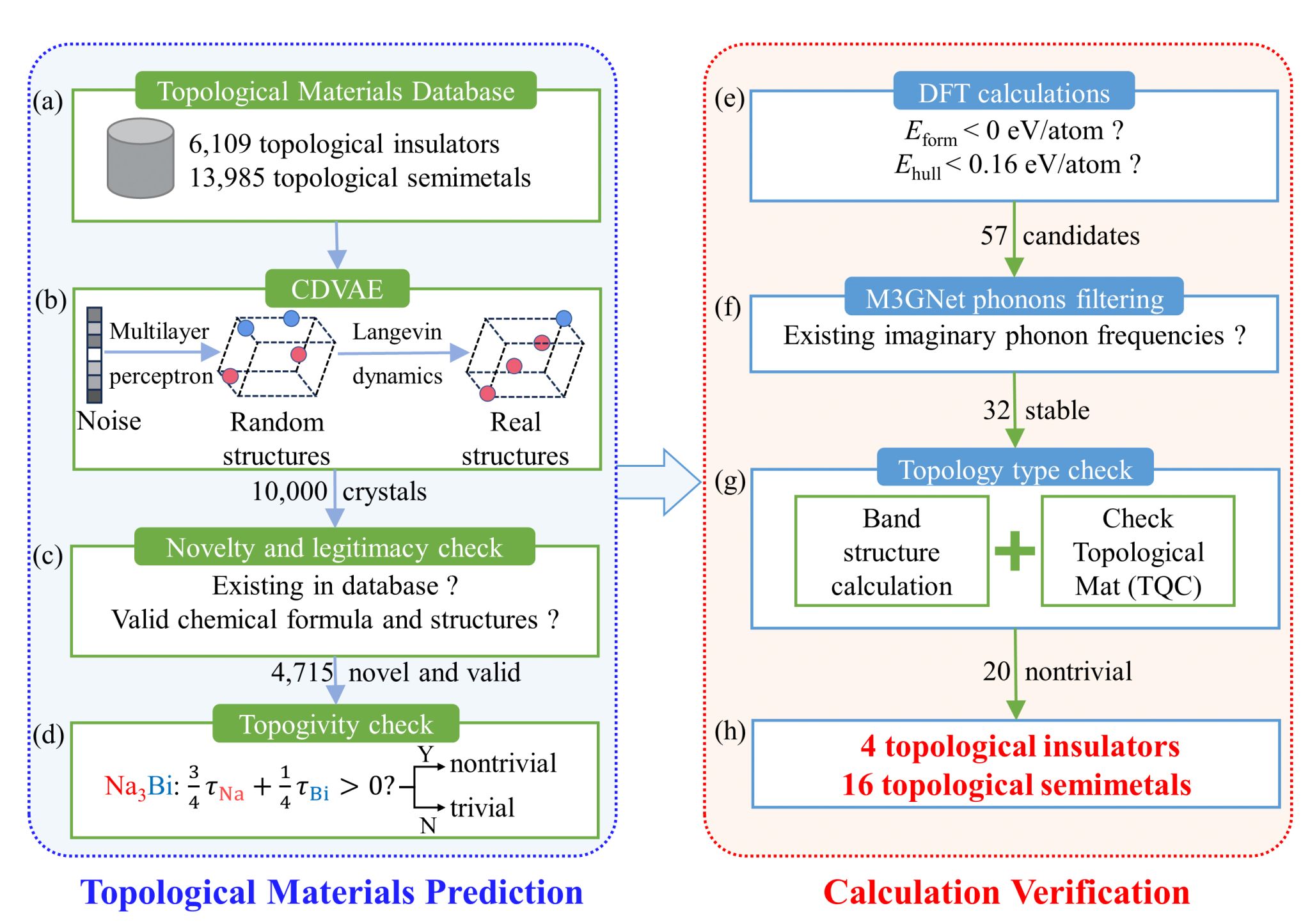 拓扑量子材料由于其独特的电子性质,吸引了物理研究和基础应用领域的广泛关注。然而,基于常规的实验和计算方法效率很低,寻找全新的拓扑量子材料面临着巨大挑战。beat365唯一官网材料基因研究团队提出了一种基于深度生成模型的逆向设计方法CTMT(CTMT:CDVAE、Topogivity、基于M3GNet的机器学习势和拓扑量子化学TQC),将专业知识和数据驱动相结合,成功发现了20种稳定且新颖的拓扑量子材料,其中包括4种拓扑绝缘体和16种拓扑半金属。这项研究成果已发表在《npj Quantum Materials》上,beat365唯一官网材料基因组工程研究院曹桂新教授、任伟教授和张统一院士为论文共同通讯作者,beat365唯一官网硕士研究生洪韬和硕士研究生陈泰康为共同第一作者,beat365唯一官网为第一单位。该创新性方法不仅加速了新型拓扑材料的发现,还为拓扑材料领域带来了全新的数据驱动材料设计思路。